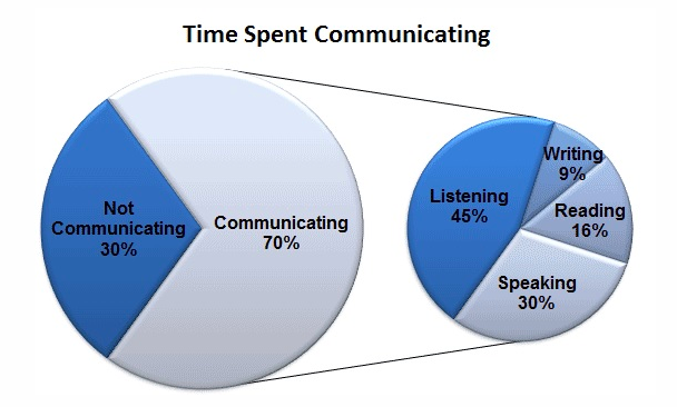 We spend about 70% of our time engaged in some kind of communication. From these 70% we spend 45% on listening, 30% on speaking, 16% on reading and 9% on writing