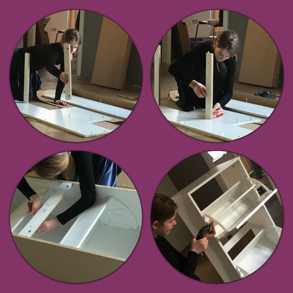 I don’t only find the practical aspect of it important, but also the conscious process of emptying one place, preparing everything for the move and rebuilding it in the new place so that we can function there again. It is all part of the transition. The more we know about the single steps, when to take them, how to do them, the more we live all this in a conscious and healthy way. At our last move we bought some new items in the famous Swedish shop and my children were all keen to build them. – In the pictures here below one of my daughters is busy building her new shoe cabinet. It didn’t take longer than if I had done it, but even if: this experience is priceless for our children and the sense of contributing to the process is so important, not to mention their feeling of competence and self-confidence. A very important life lesson.
