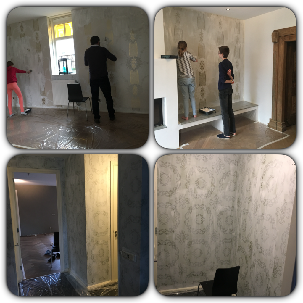 When our contractor cancelled on us (because of health reasons) a few days before he should have started, I decided to go ahead with plan B. As a family we decided that painting the walls in three rooms on the ground floor was first priority and we had enough time buffers so we bought the painting and enough paint brushes for everyone to contribute. As taking off all the wallpaper would have gone beyond our time constraints, we opted for painting them instead. It took us 2 days to paint and repaint twice to cover the wallpaper on a side note: in one of the pictures here below my son is encouraging one of his sisters. What you don’t see is that he did most of the first layer painting in 2 rooms (and I haven’t taken pictures of all the walls).