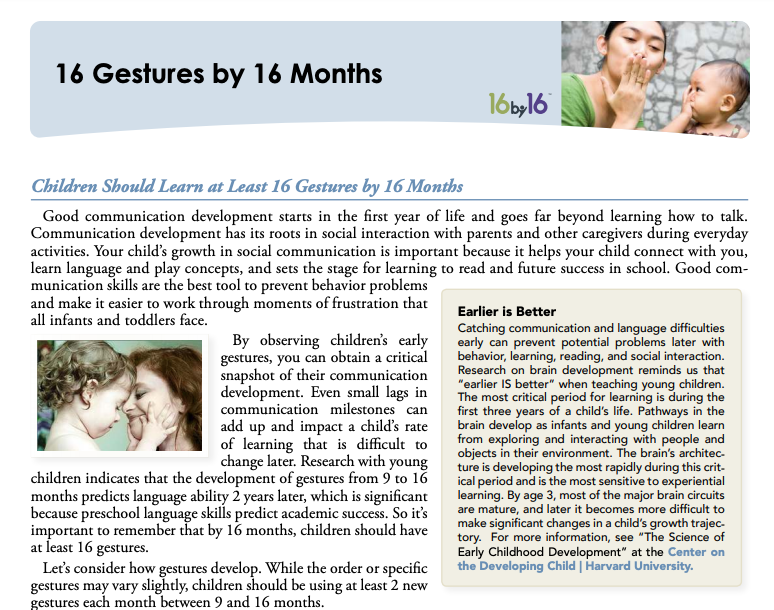 Research with young children indicates that the development of gestures from 9 to 16 months predicts language ability two years later, which is significant because preschool language skills predict academic success. So it’s important to remember that by 16 months, children should have at least 16 gestures. – On the Reading Rockets website you can find an interesting pdf file with 16 Gestures by 16 months.