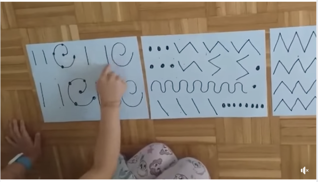 Try to do the same with songs you sing with your child and let your child guide you with shapes, zigzag lines, colors… anything that works for them to represent words or melodies, will help them distinguish words, articulate them, find the rhythm of the language they are learning!