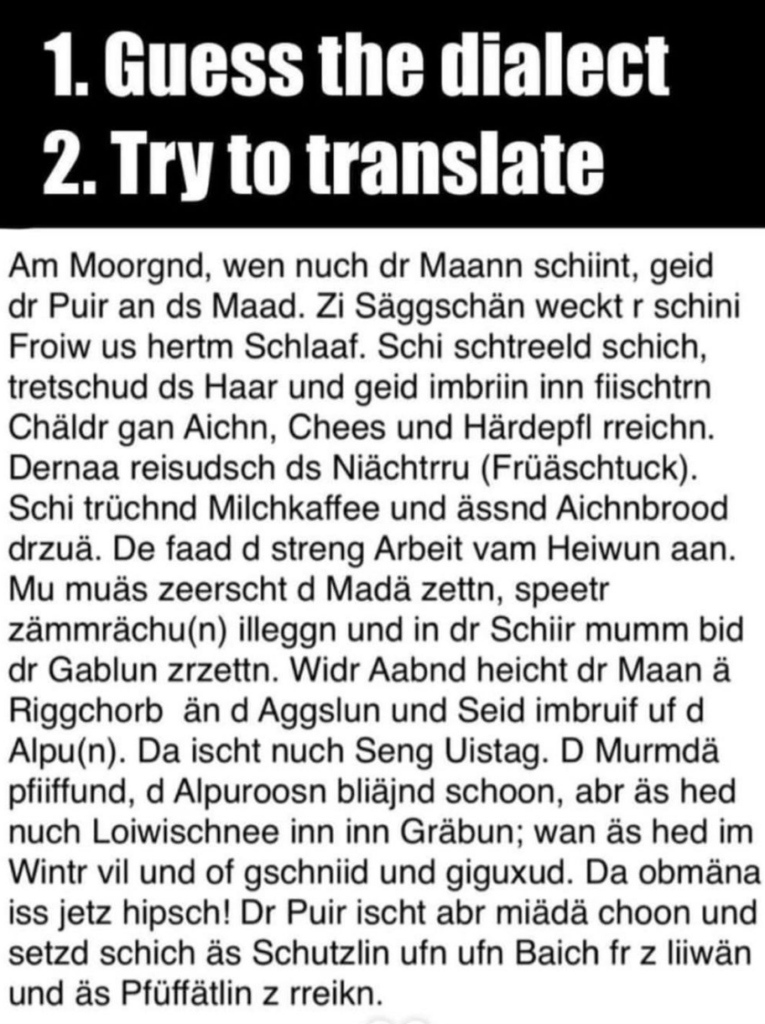 When someone shared a post on facebook lately, about a text that people didn't seem to recognize, I talked about it with my family, and when we read it out loud, my daughters immediately said that it sounded like the dialect they heard during our last holidays in Switzerland. We only spent 3 weeks in that region in 2019, but this was enough for them to remember the sound of the local dialect, and to recognize it 3 years later.